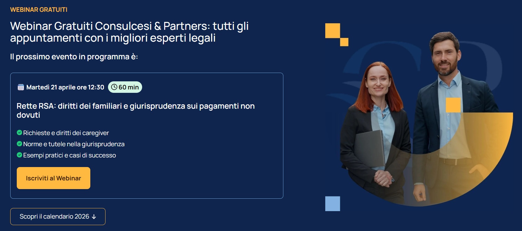 • 21 aprile (ore 12:30) “Rette RSA: diritti dei familiari e giurisprudenza sui pagamenti non dovuti”, un tema sempre più attuale che affronta il ruolo dei caregiver, le ultime pronunce e i casi in cui è possibile opporsi a richieste economiche illegittime.